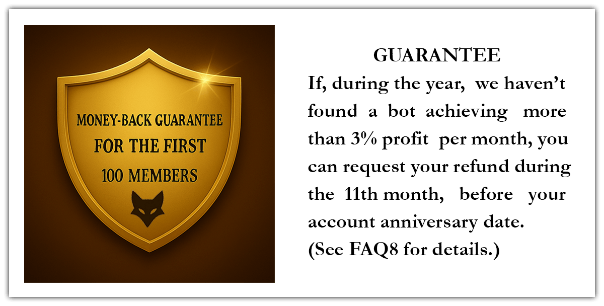 If, during the year, we haven’t found a bot that achieves more than 3% profit per month, you can request your refund during the 11th month, before your account anniversary date.